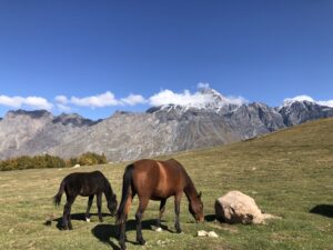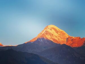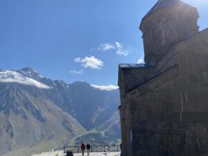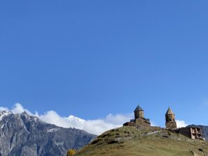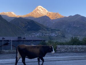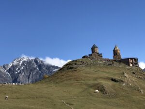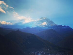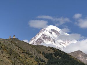 カズベキとは、カズベキ山のことです。ゲルゲティ三位一体の背後にそびえ立つ、標高5,047メートルの聖なる山です。