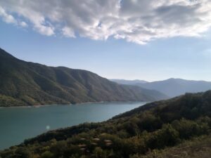 エメラルドグリーンに輝くジンヴァリ貯水湖。ジョージアの首都トビリシ市民の水源です。
