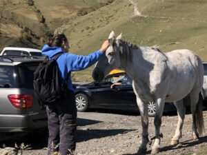 バスターミナルから、カズベキ山の麓ステパンツミンダ村までは、「ジョージア軍用道路」を通っていきます。1799年にロシア軍が軍事用に切り開いた道で、大コーカサス山脈を超えて、北オセチア共和国の首都ウラジカフカスまで続いています。オセチア人は、古代アラン人の直系で、ヨーロッパと中央アジアの交差点の民族と言われています。