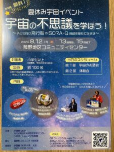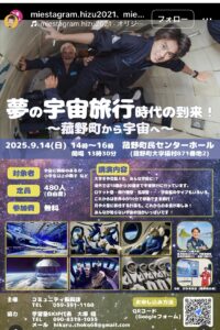 故郷の菰野町の、すべての小学校と中学校で民間宇宙飛行士TAICHIさんの宇宙講演会を開催、インド人の宇宙開発の研究者による講演会、子供向け飛行船の操縦体験会、SORA-Qの体験会、日本火星協会所属の大学教授による講演会、YouTube宇宙チャンネル開設、子ども食堂で宇宙のお話会、宇宙をテーマに世界各地に住む子ども達が参加するオンラインイベントなど。